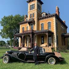One of the truly extraordinary homes that we came across as we wondered through town was The Lebold Mansion. It looks, especially on a dark day with lightening flashing, like an old vampire movie set! The house was built of native Kansas Limestone in 1880 by a successfully Abilene banker and land agent, Conrad Lebold. He later became the Mayor of Abilene and a member of the Kansas State Legislature. The house has gone through some hard times and in 2021 it was bought at foreclosure and has been restored. According to one of the railroad employees, the owner is quite a character. Spooky old movies and TV shows have been the inspiration for much of the current refurbishment and the owner drives through town in a Zimmer Golden Spirit automobile (one of only 1,500 ever made) that looks shockingly like Cruella DeVil’s Car in 101 Dalmatians! We didn’t see the car, but I found a picture online of the current owner and his car and am including it below. It was also interesting that when I was taking pictures of the mansion, a huge flock of black birds were circling the tower the in mansion. It seemed, well, fitting!!